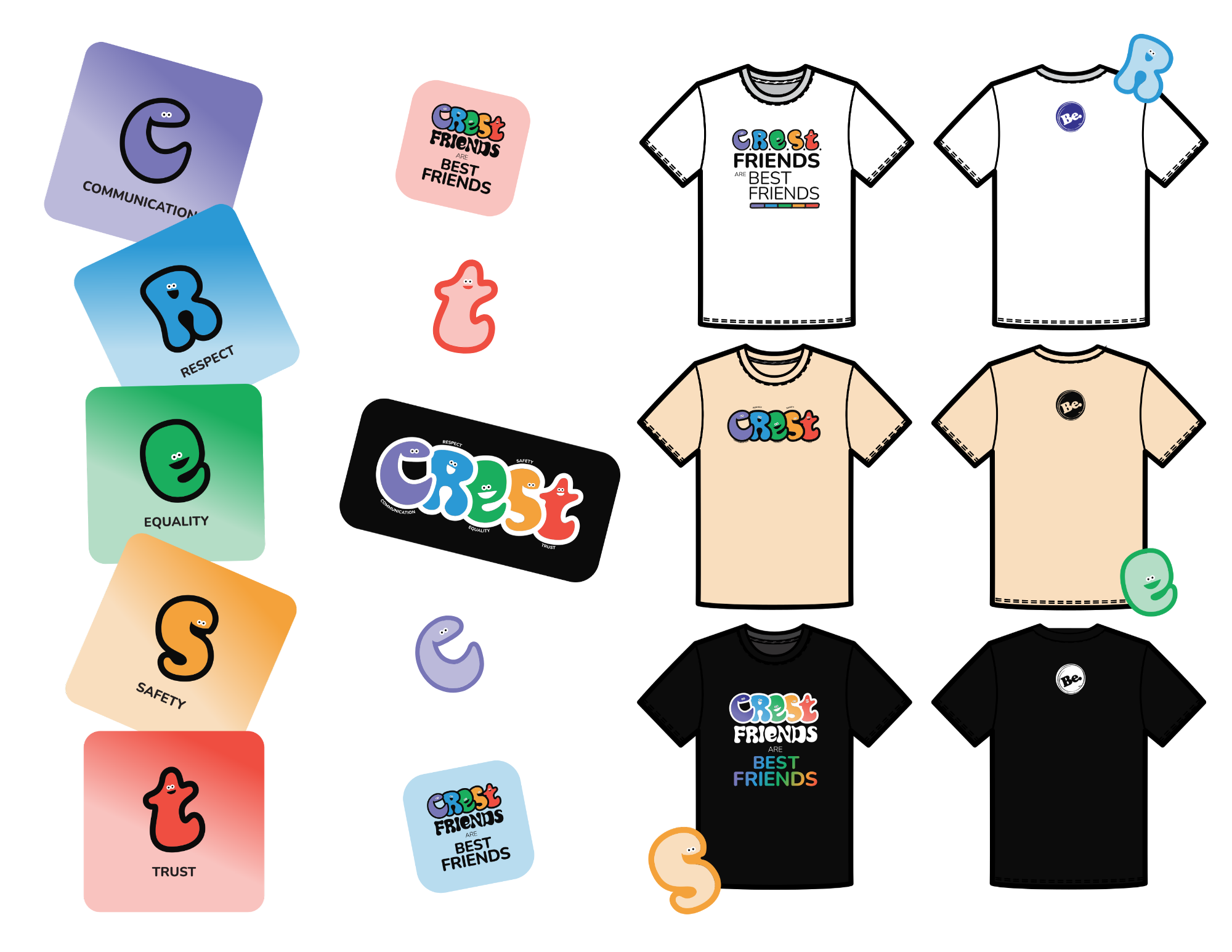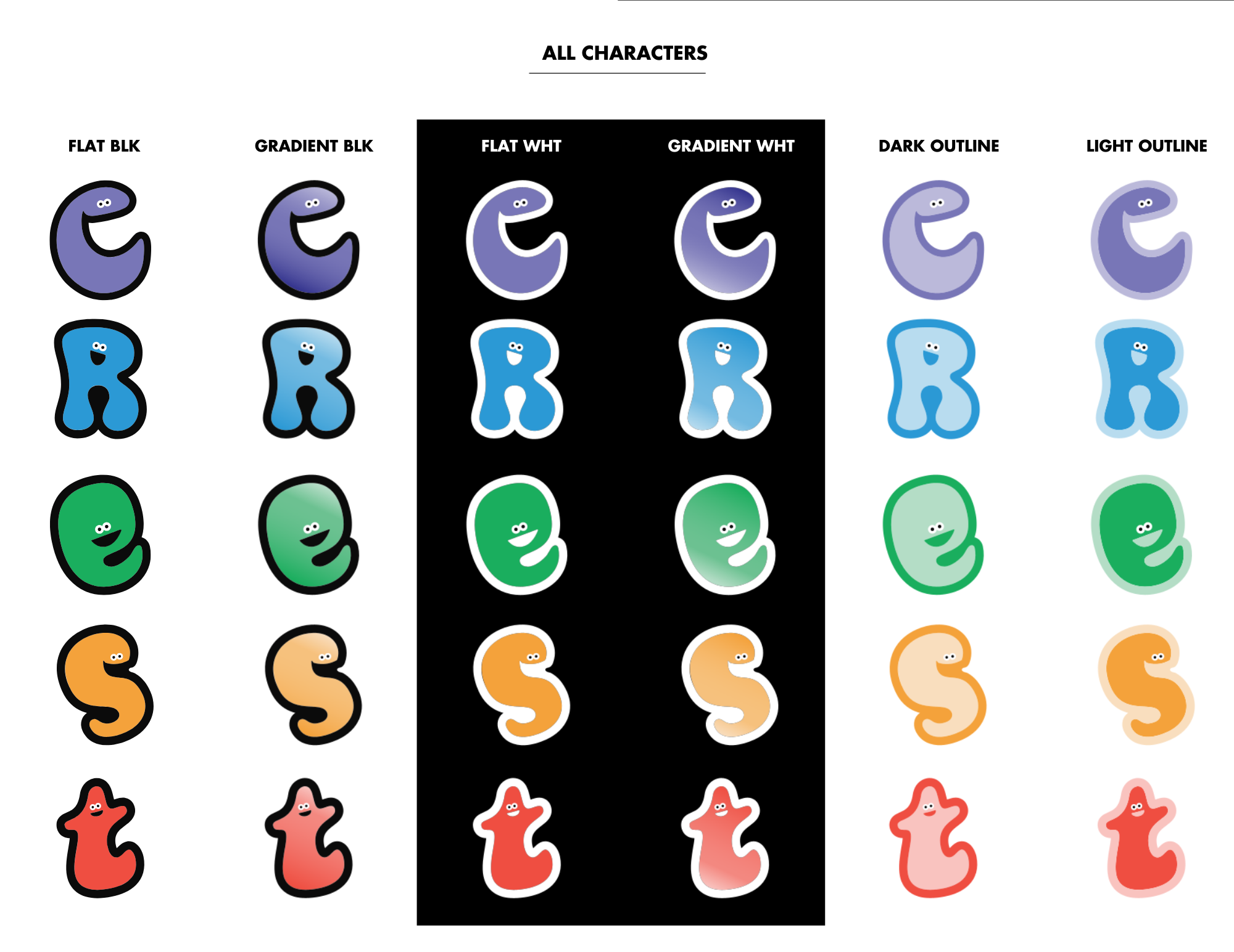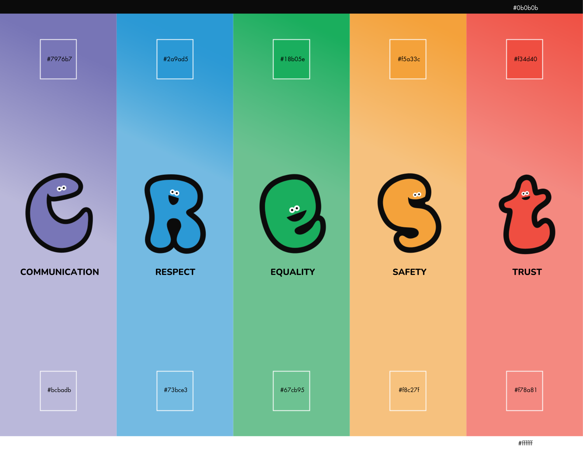 A set of characters designed for the domestic violence shelter The Family Place. Intended to help teach kids and young adults about five of the most important aspects of a healthy relationship: Communication, Respect, Equality, Safety and Trust. These characters were designed with over 50 variations for a variety of media applications such as die-cut versions for stickers, alternate color options for dark and light backgrounds whether printed or digital.
